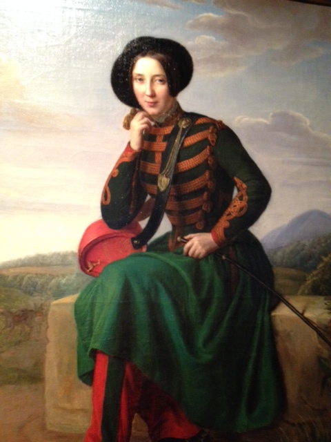 Among the hundreds and hundreds of stiff military portraits and battle scenes in Les Invalides, the military museum in Paris, this sturdy but friendly woman stands out.  She was Madame Bru, one of the few respectable women allowed and even encouraged to follow the French army. She was known as the “cantiniere” of the 7th Regiment of Hussars.  She and no doubt some other women like her organized mobile canteens which provided the soldiers with food, drink and tobacco.  Many times, they also served as nurses. They were sometimes awarded military medals for their services. Madame Bru, painted in 1837, was no doubt a beloved figure in “her” regiment.