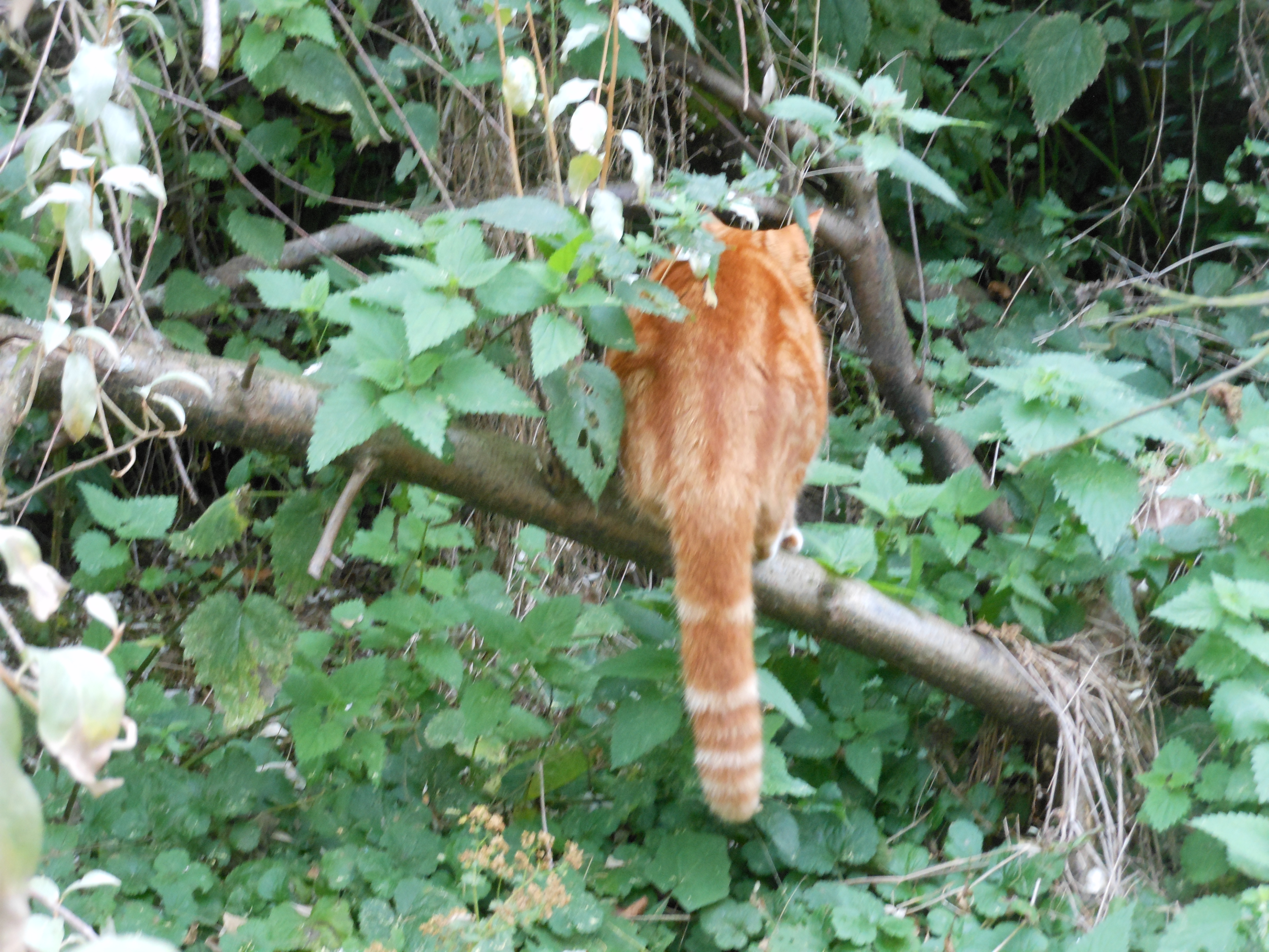 He perched on a branch, watching the ground intently and switching his orange-and-white-striped tail.