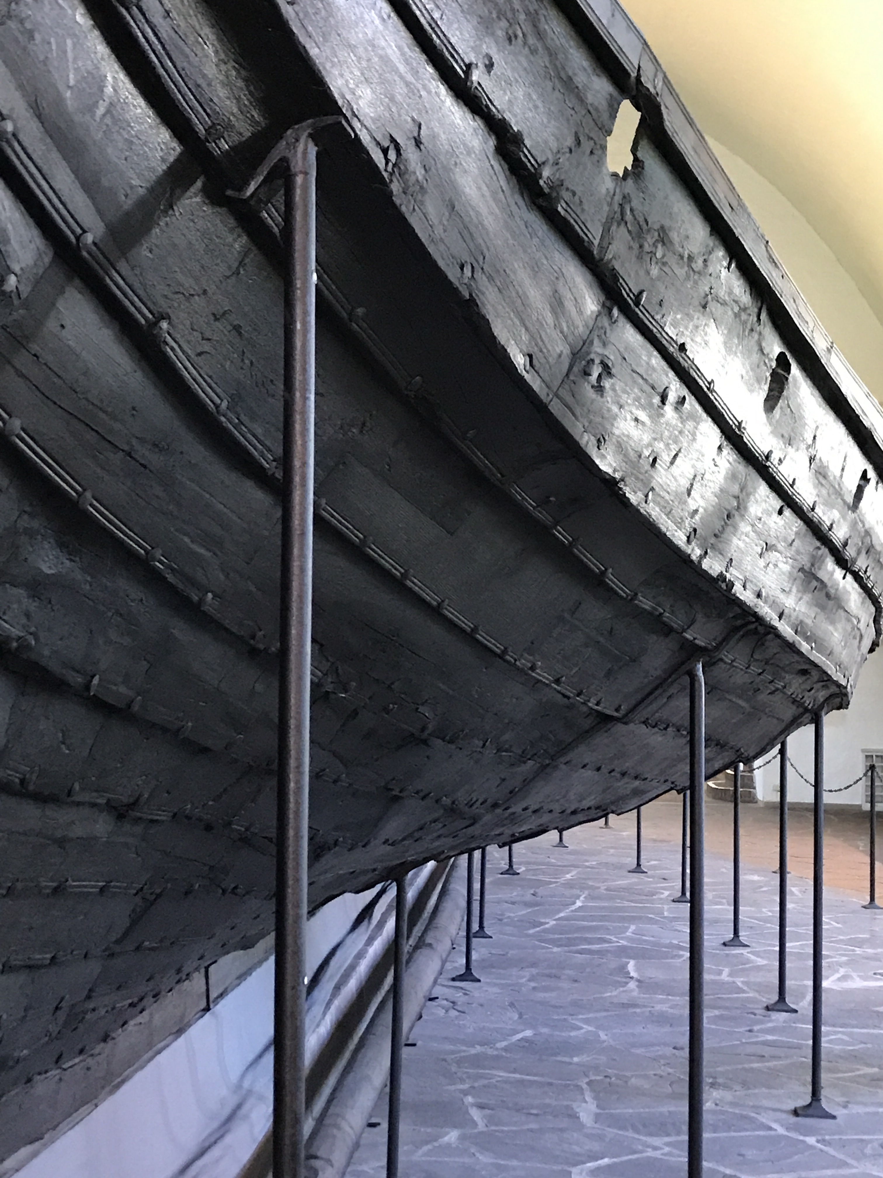 Oar openings are still present–fifteen of them on this boat. Still-intact shields were hung from some of the oar holes.