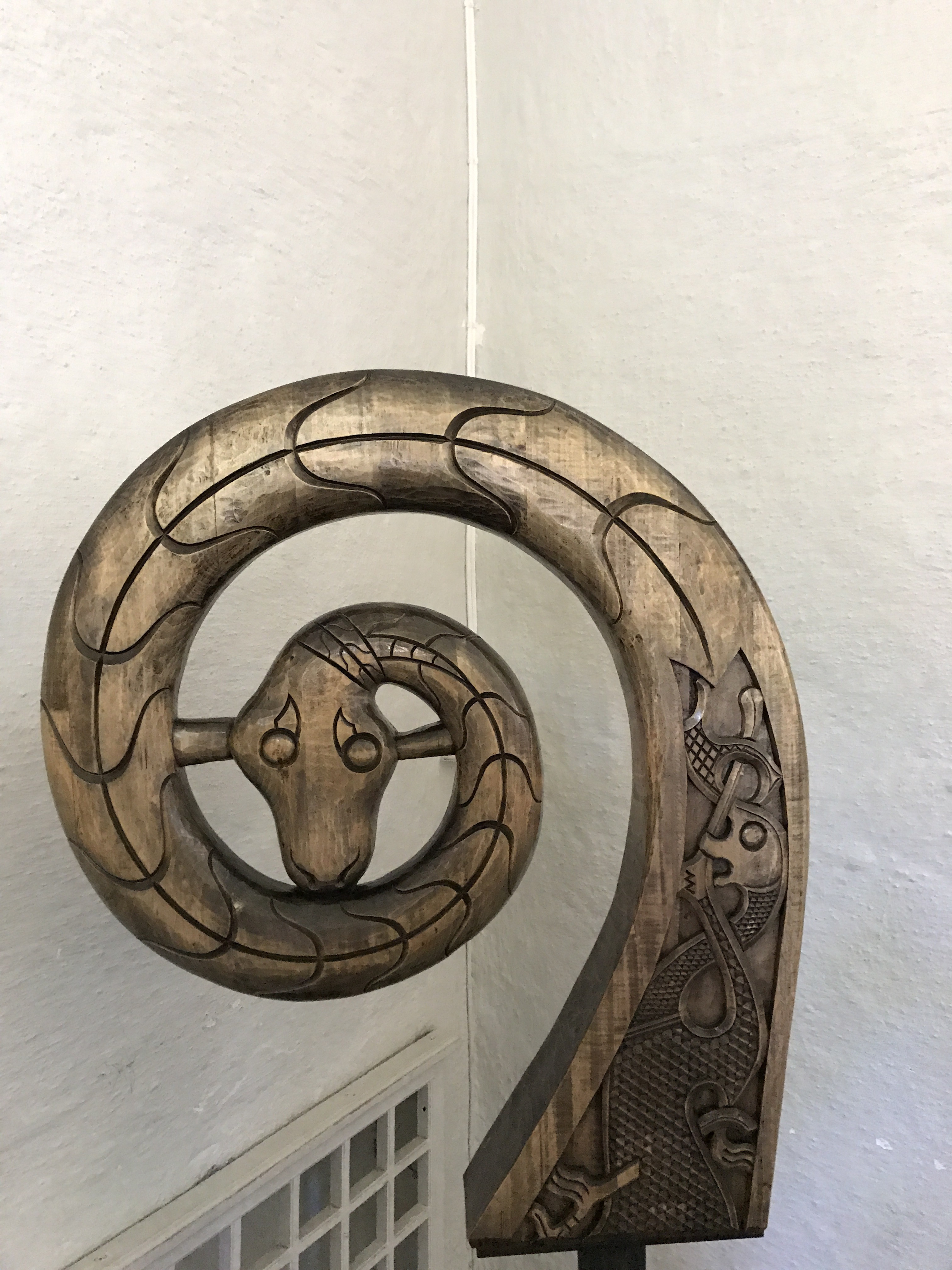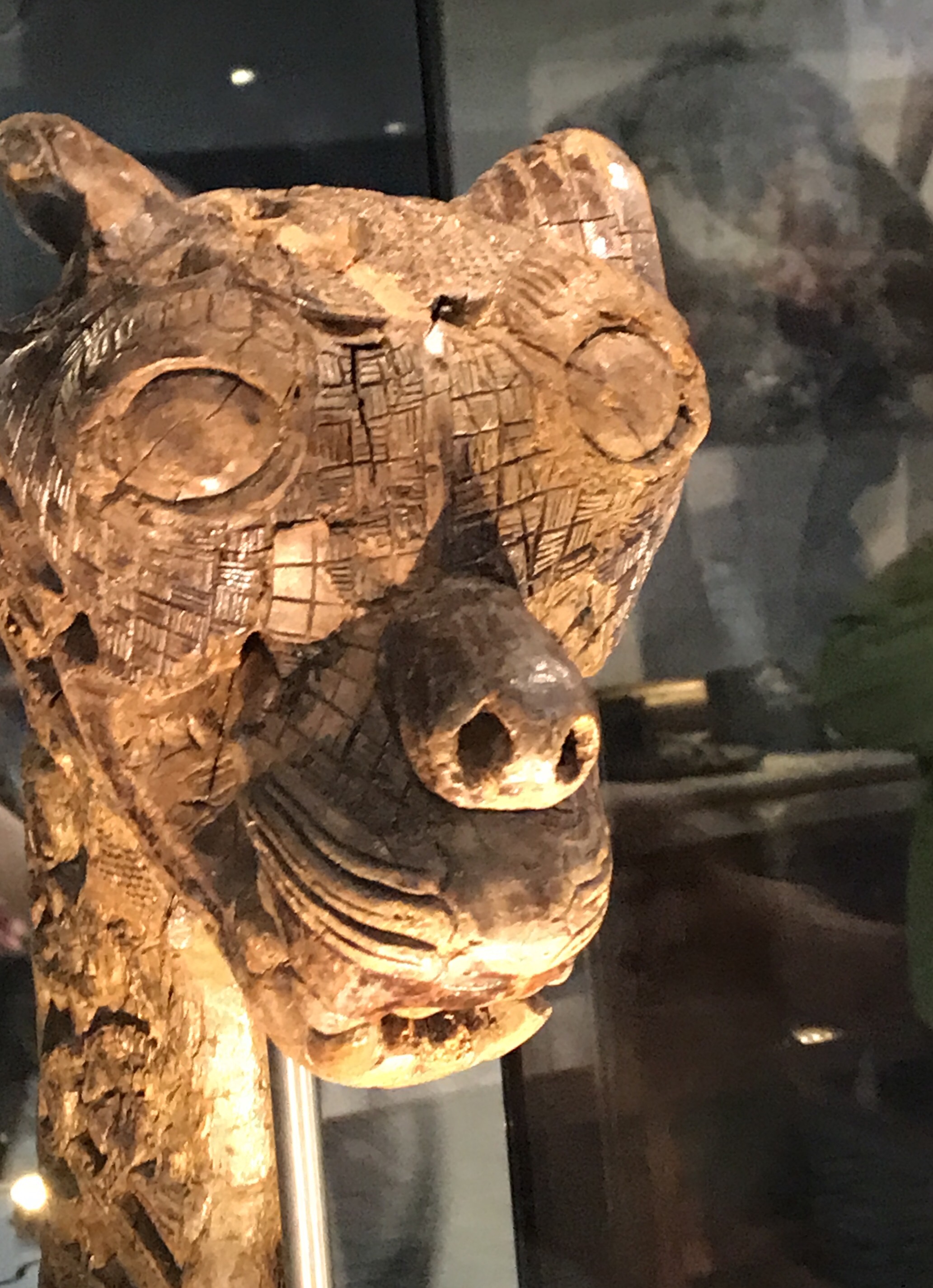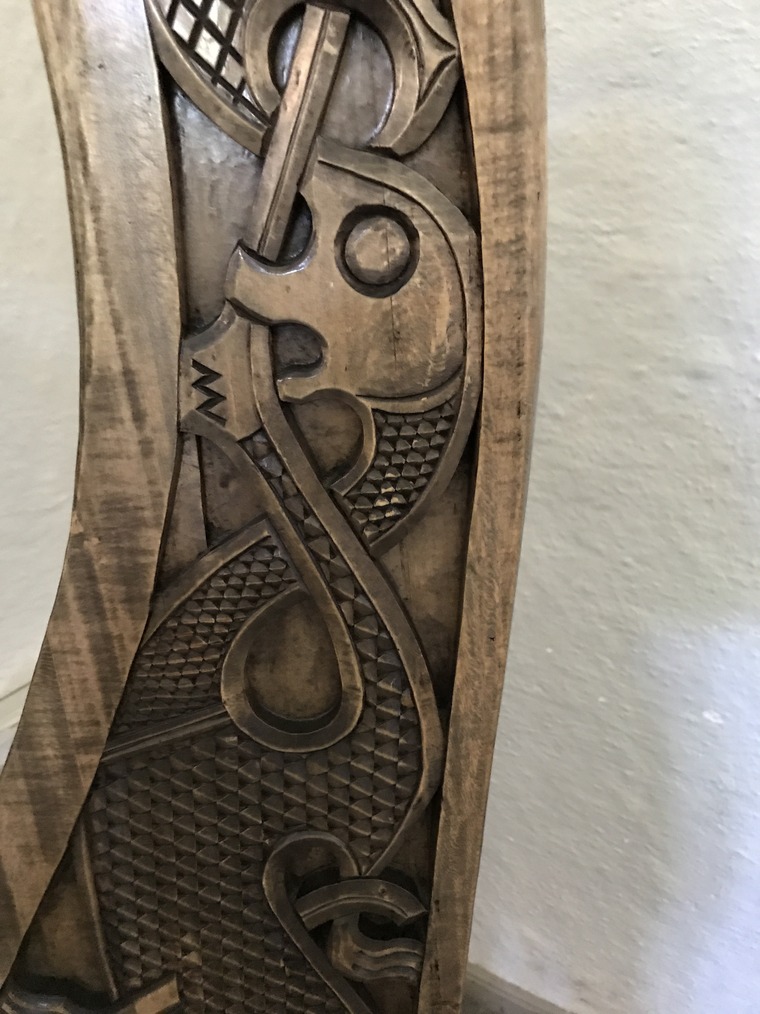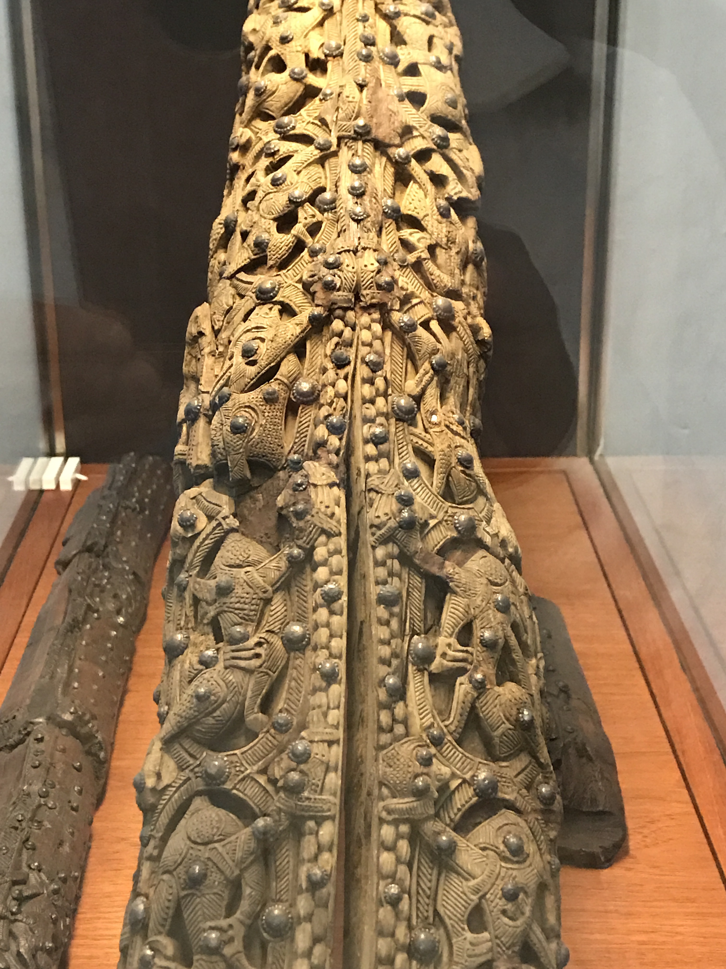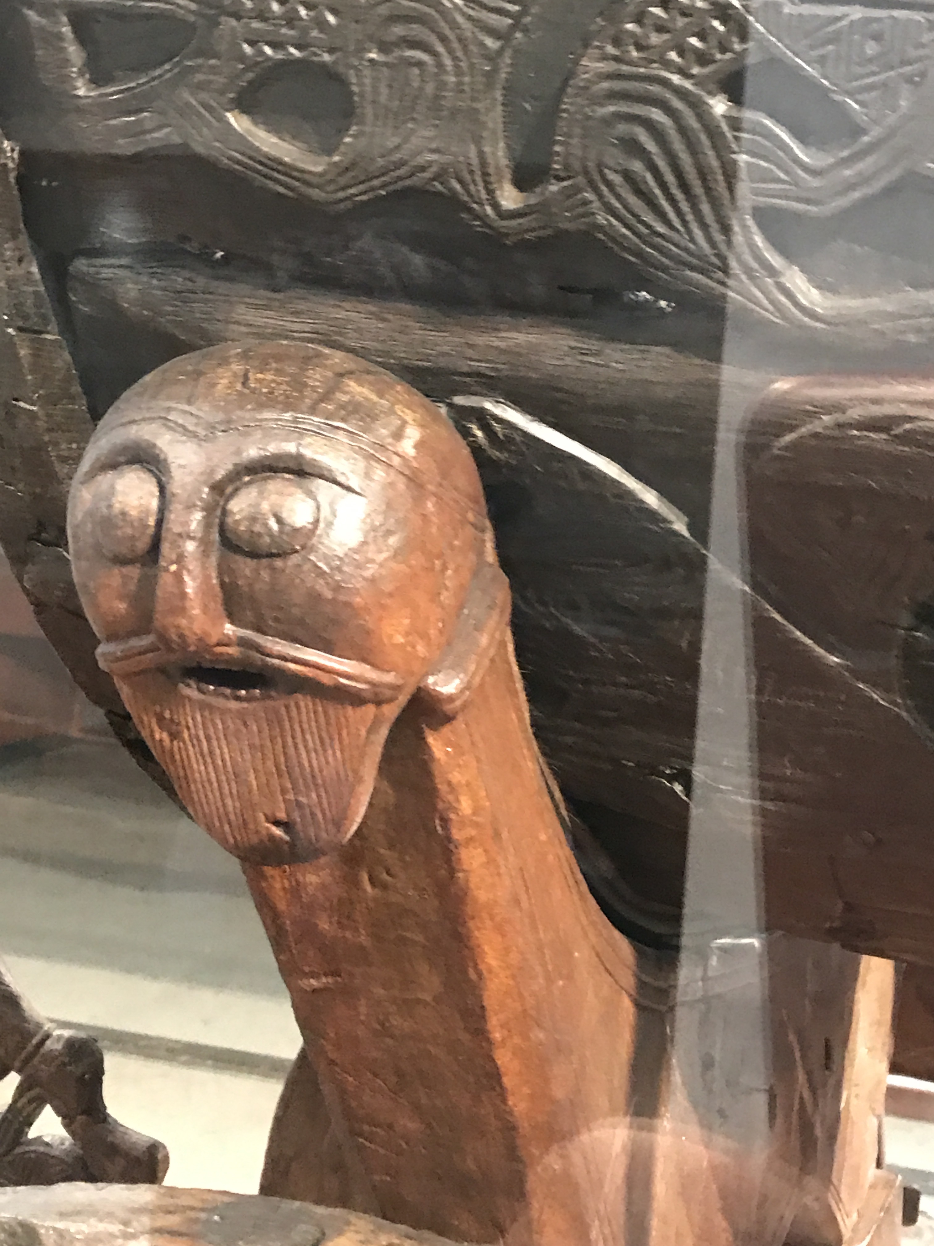He’s part of a fantastically carved wooden cart found with the Oseberg ship. Vikings were known to use utilitarian carts, but this elaborate one was most likely used in ceremonies and religious processions.