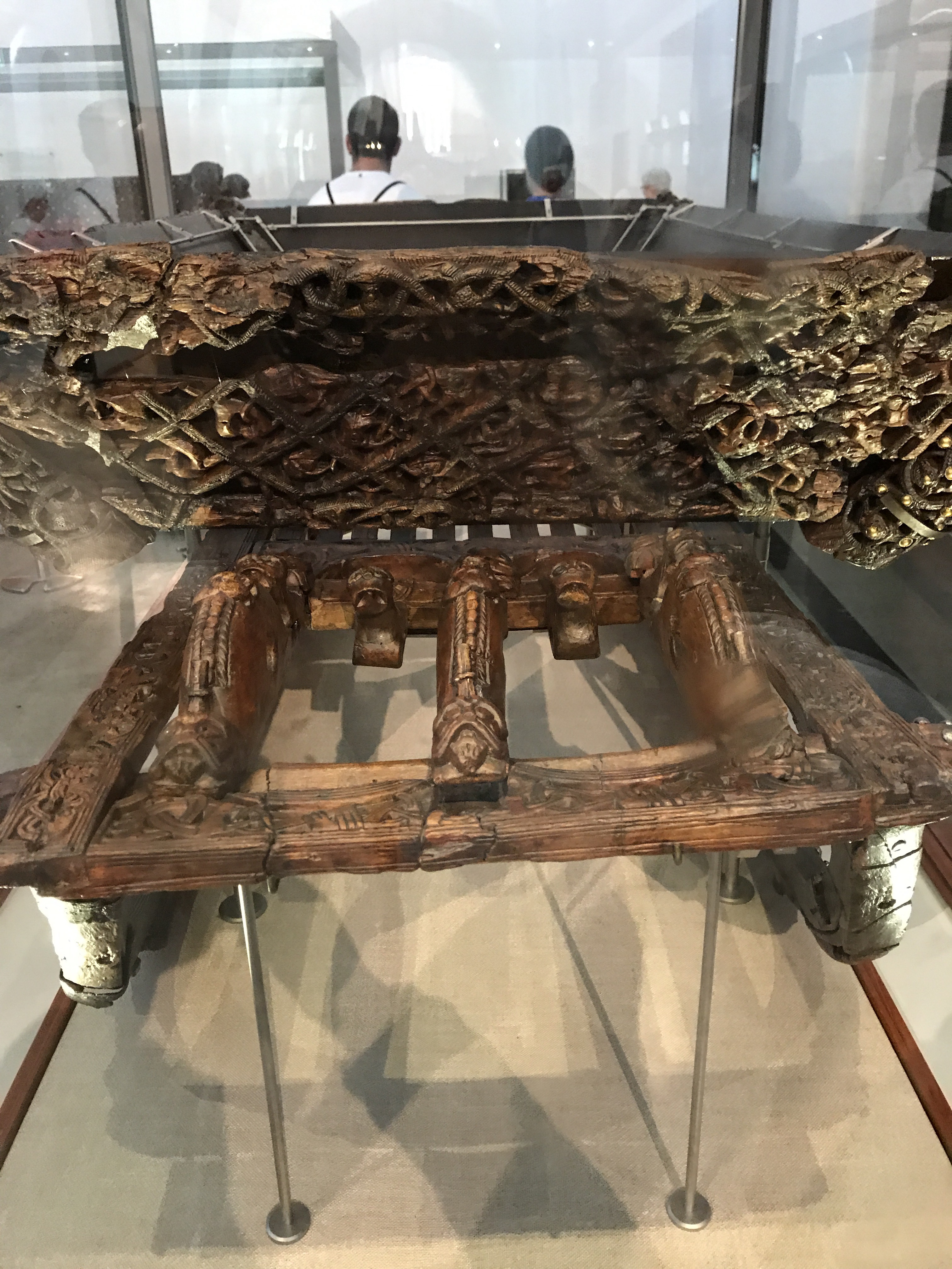The cart is made of oak. Every surface is covered with carved people and animals, possibly showing Norse legends or historical events.