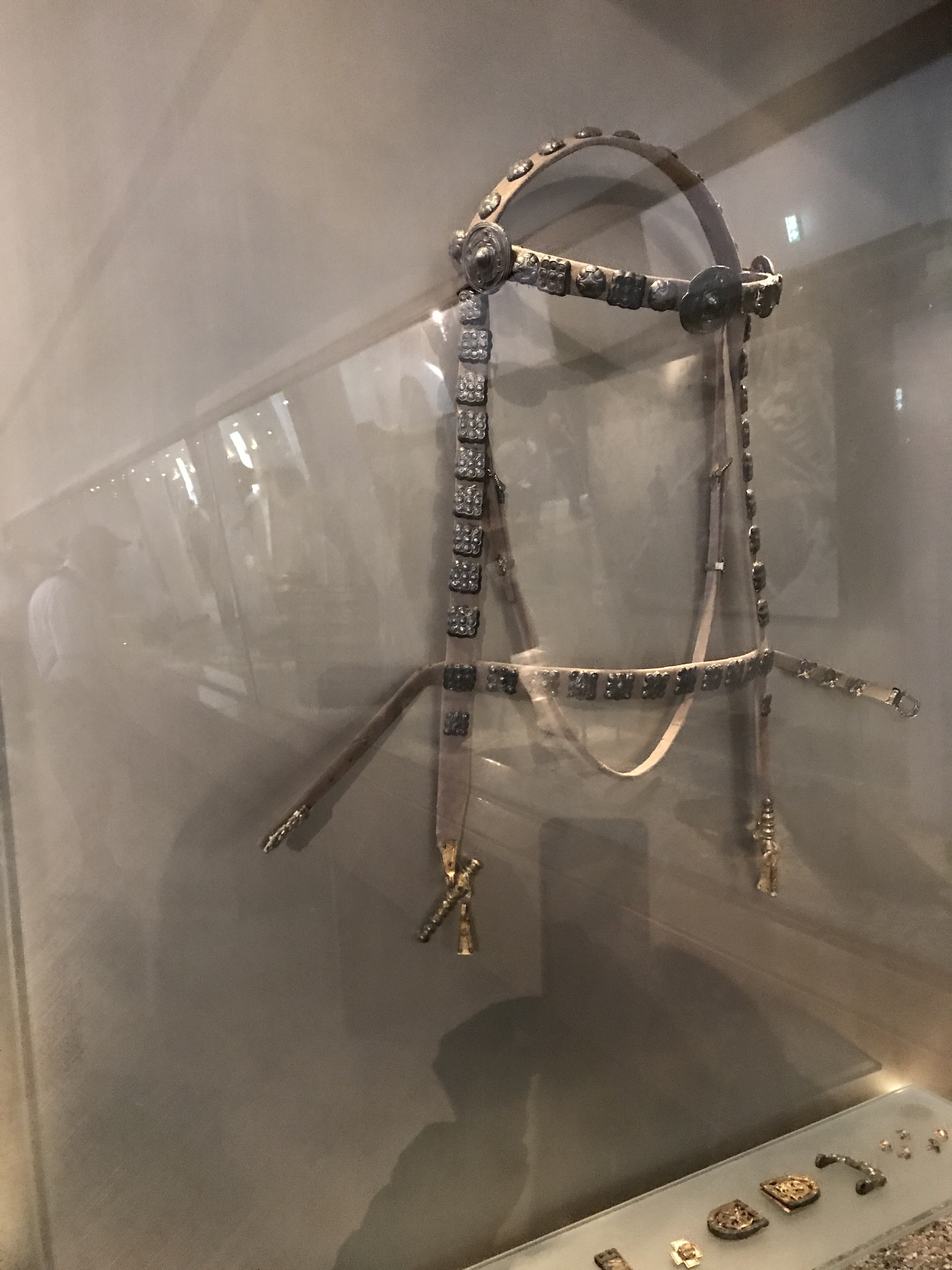 The cart was most likely pulled by two horses. A bridle, decorated with metal studs, is on display in a case nearby.