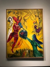 The exhibit begins with some borrowed paintings that illuminate Chagall’s lifelong passions for music, performance, and colorful memories of his childhood village in Russia. The painting above is “The Red Circus,” 1956-1960.