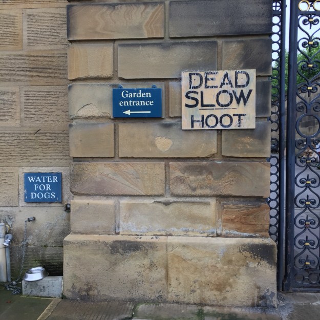 The British love to visit old houses, and they love their dogs. Most National Trust properties encourage dog-walking on the grounds. So do a lot of privately-owned mansions, like Chatsworth. (I also love the very British wordage beside this gateway, “Dead Slow, Hoot.” Translation: If you’re driving into the courtyard, roll ahead at a snail’s pace and lean on your car horn).