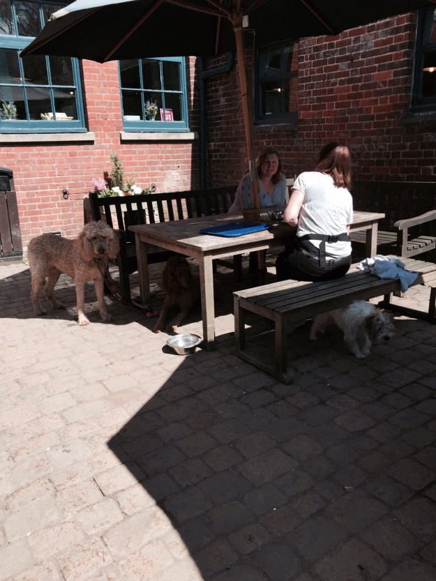 National Trust properties almost always have teashops where dogs are welcome at the outdoor tables. The dogs are always polite, though they do cadge table scraps.