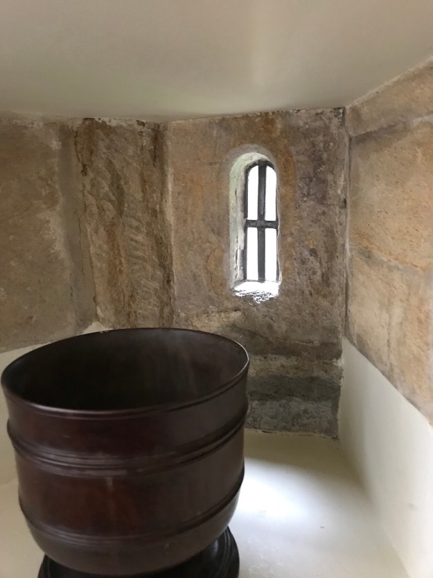 The squint is positioned so that a person could stay inside the house by the fire and still see Mass being celebrated in the little chapel next to the house–which most likely happened regularly in medieval times.