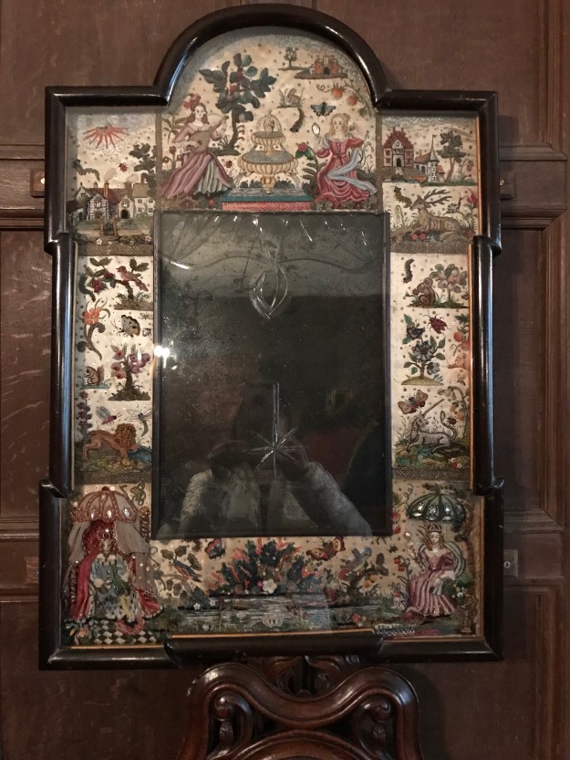 But National Trust properties, which have often come from families hard hit by misfortune and crushing inheritance taxes, lovingly preserve the old stuff that came with the property. The mirror frame above, at Lytes Cary, was worked up in the old needlework technique of “stumpwork” in the 1600s. In the early 1900s, a relative of the newest owner learned the technique and added some panels, including the view of the house in the upper left-hand panel.