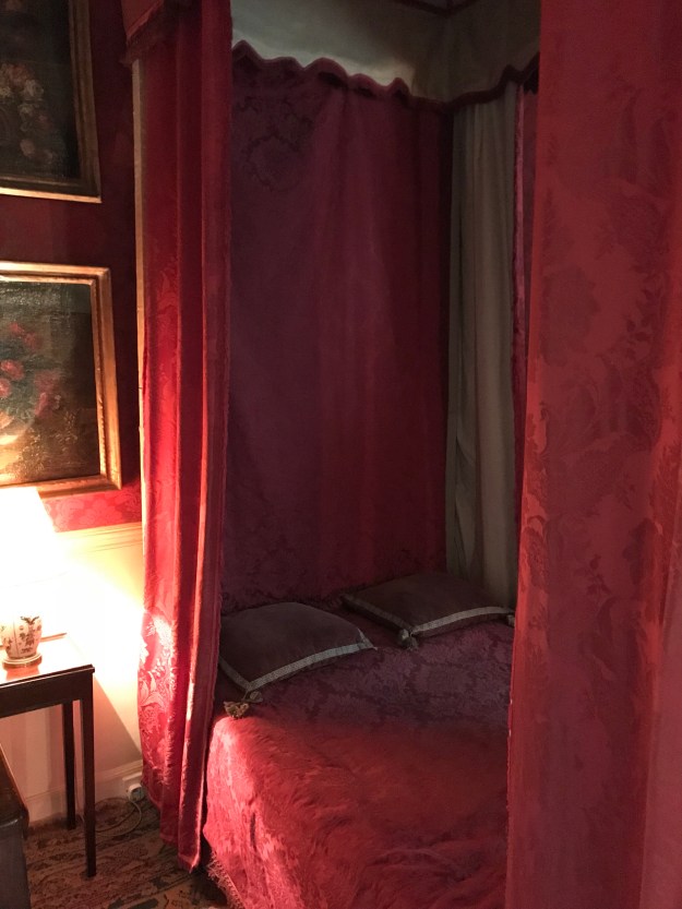 Another bedroom features a “campaign bed” from around 1800. From Napoleonic times up through the Victorian era, aristocratic military officers who were used to comfy canopied beds ordered custom-made fold-up ones to take with them to training camp and even to battlefields. Why not live in the style to which they were accustomed?