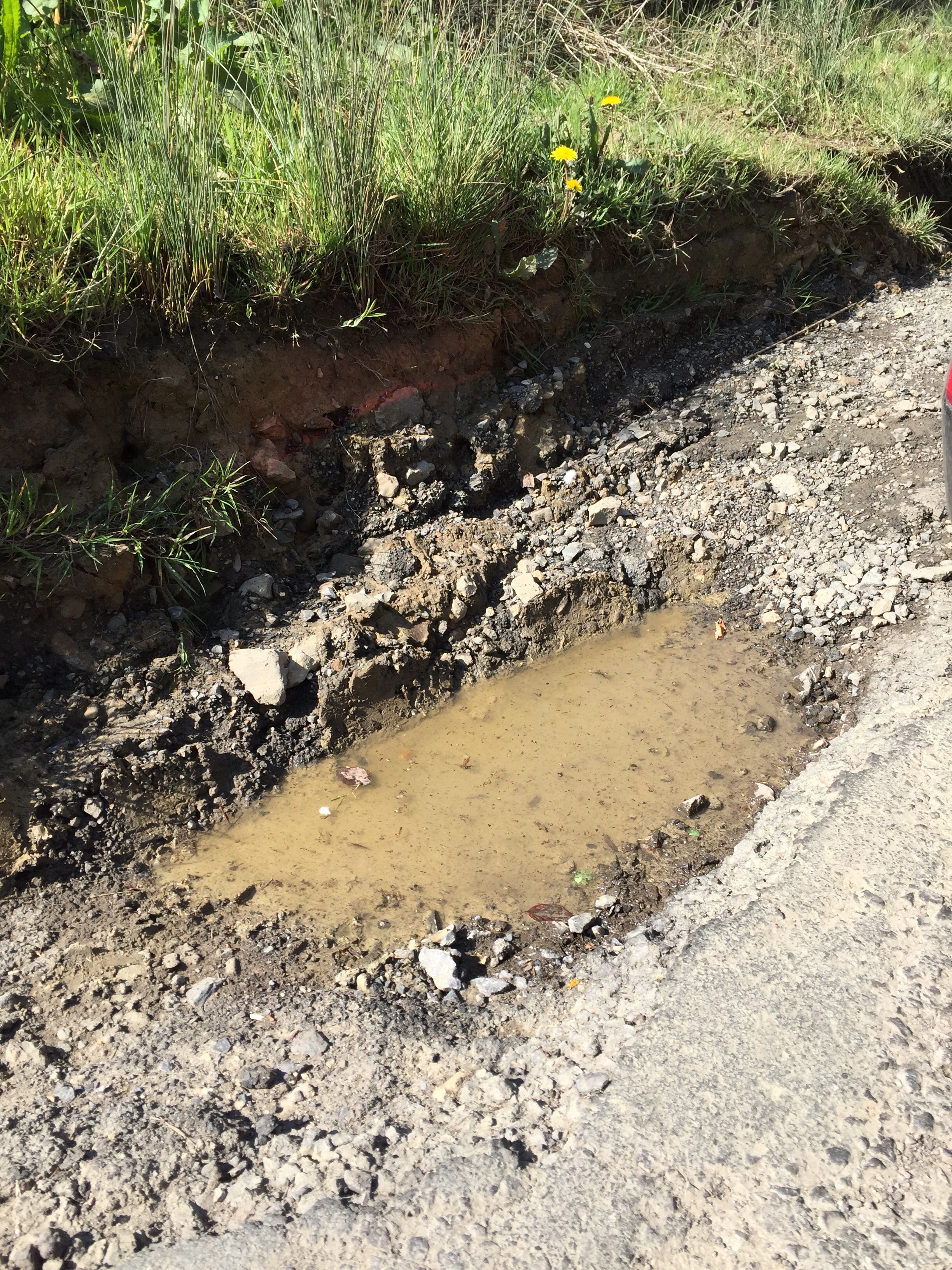We should have been on the lookout for hidden springtime potholes too. This one caused not one but two flat tires on our rental car. Country roads are narrow, we’re driving on the “wrong side,” and sometimes we have to swerve.