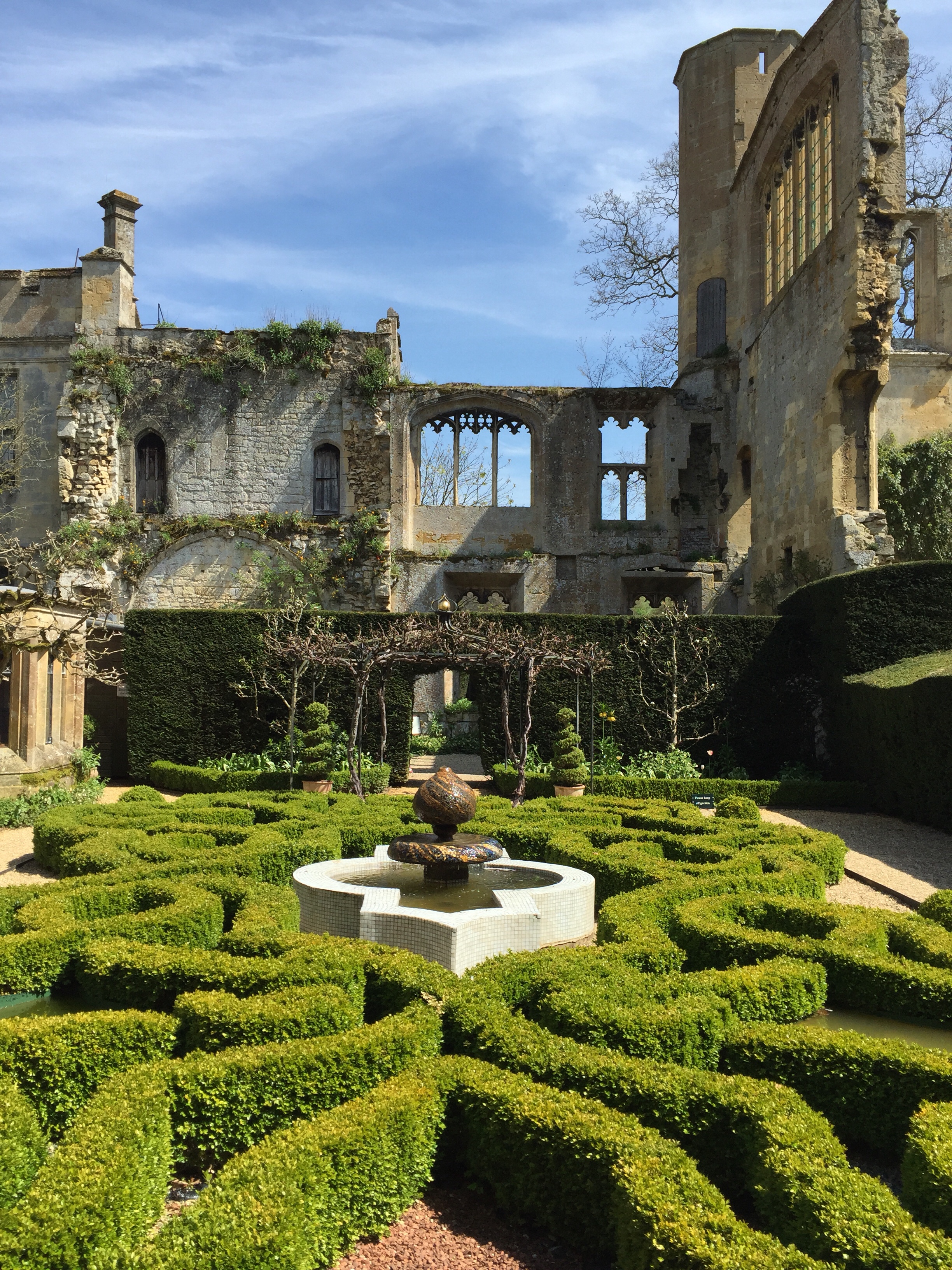 The tulips and daffodils were in bloom at Sudeley Castle in Winchcombe, where Richard III’s banqueting hall lies in picturesque ruins, sheltering a Tudor Knot Garden (planted much later, using Tudor designs).