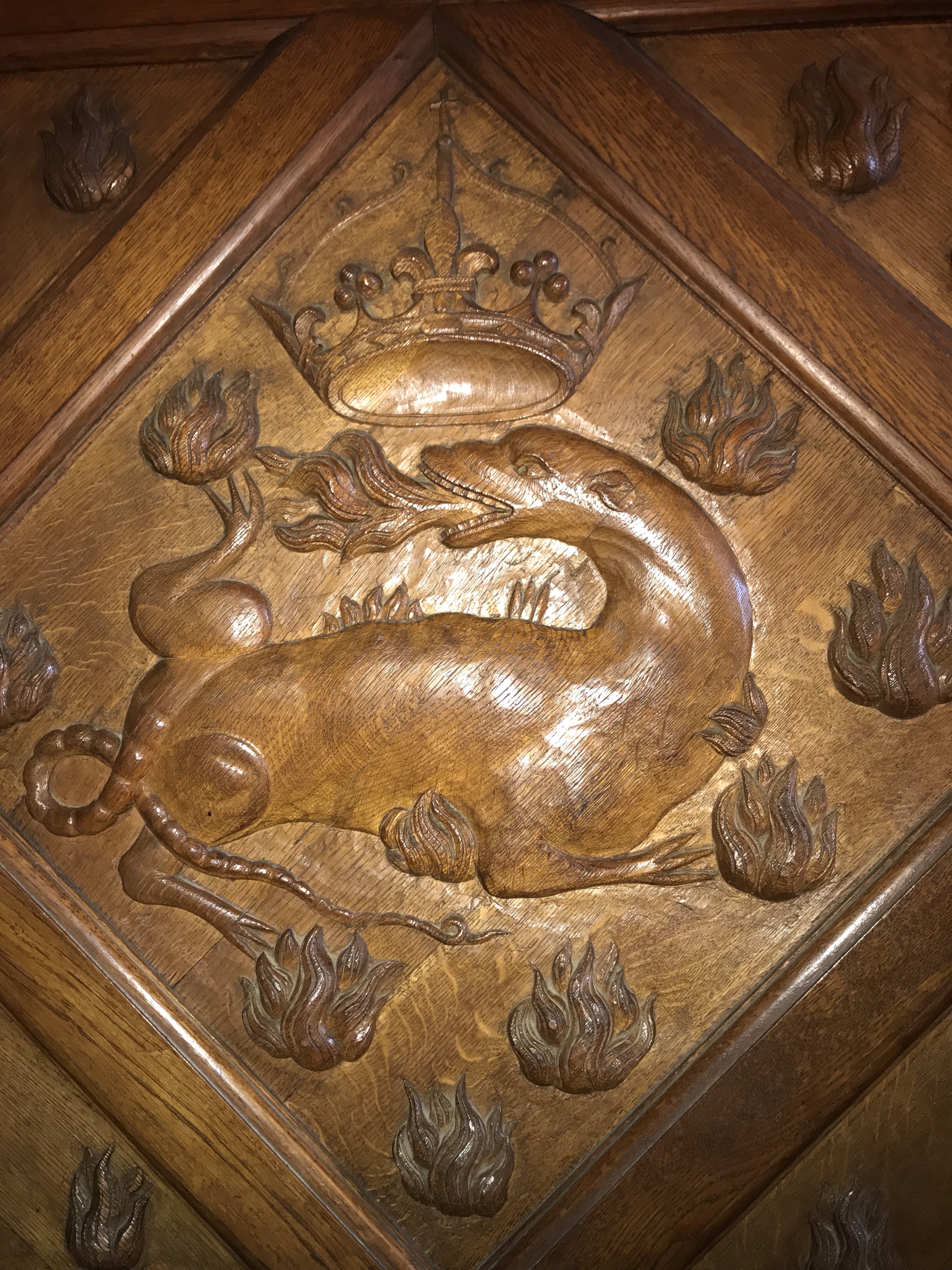 The chapel is tiny but exquisite. The facade tells the story of St. Hubert. He seems to have been an actual person, born around 656 to 658 in Toulouse. By the time he died on May 30, 727, he had become the first Bishop of Liege.