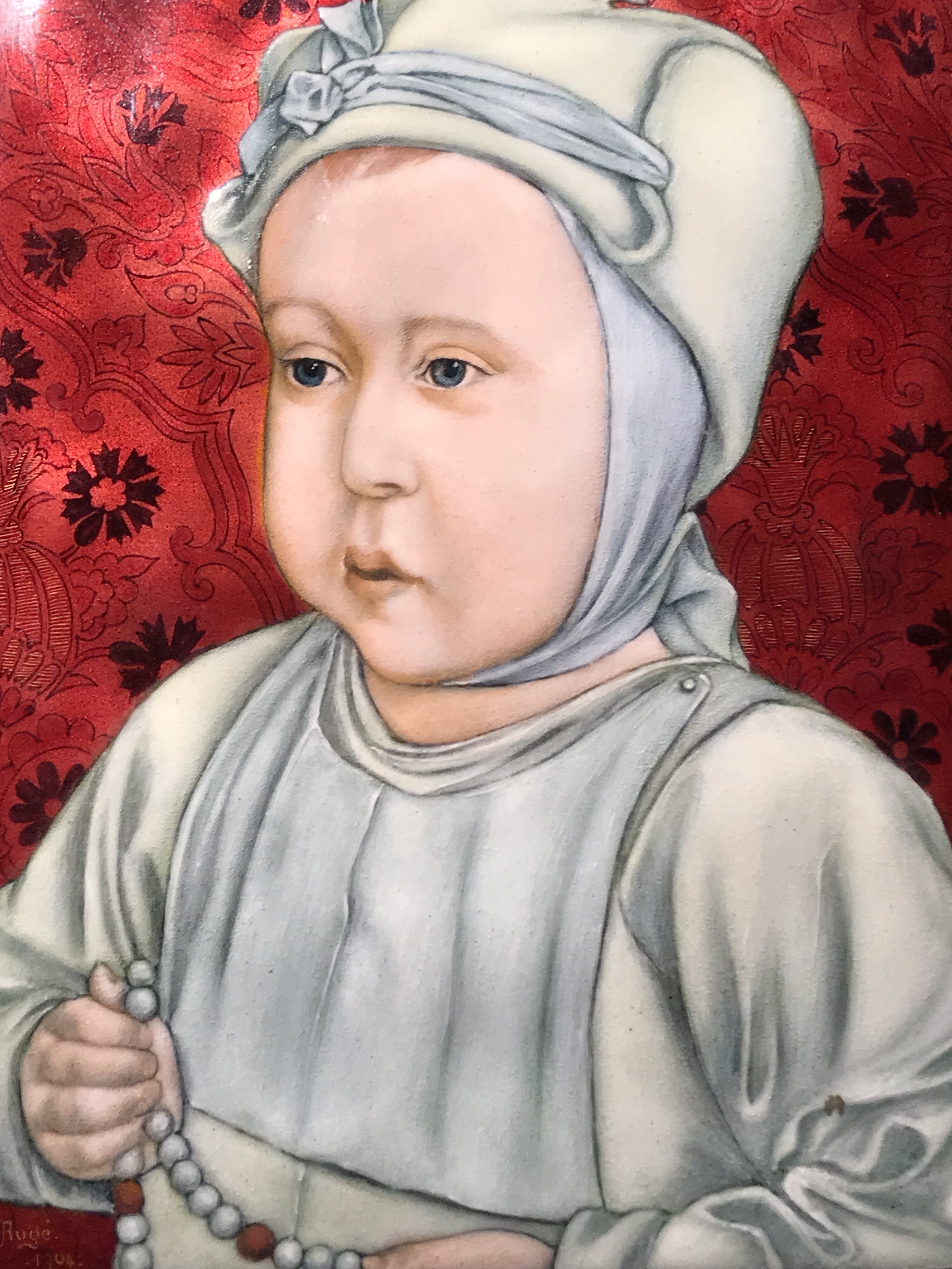 Anne dutifully spent her life trying to produce a male heir, first with one royal husband, then with another. She never succeeded. One report says that she was pregnant about every 14 months, but only two daughters survived to adulthood. (One daughter was Queen Claude, wife of King Francois I. If anything, her royal life was even more trying than her mother’s, and she died at age 24). A touching 19th century enamel, above, depicts one of Anne’s sons, who died as a small child from measles. Anne died of a kidney stone attack at age 36, worn out from constant pregnancies.