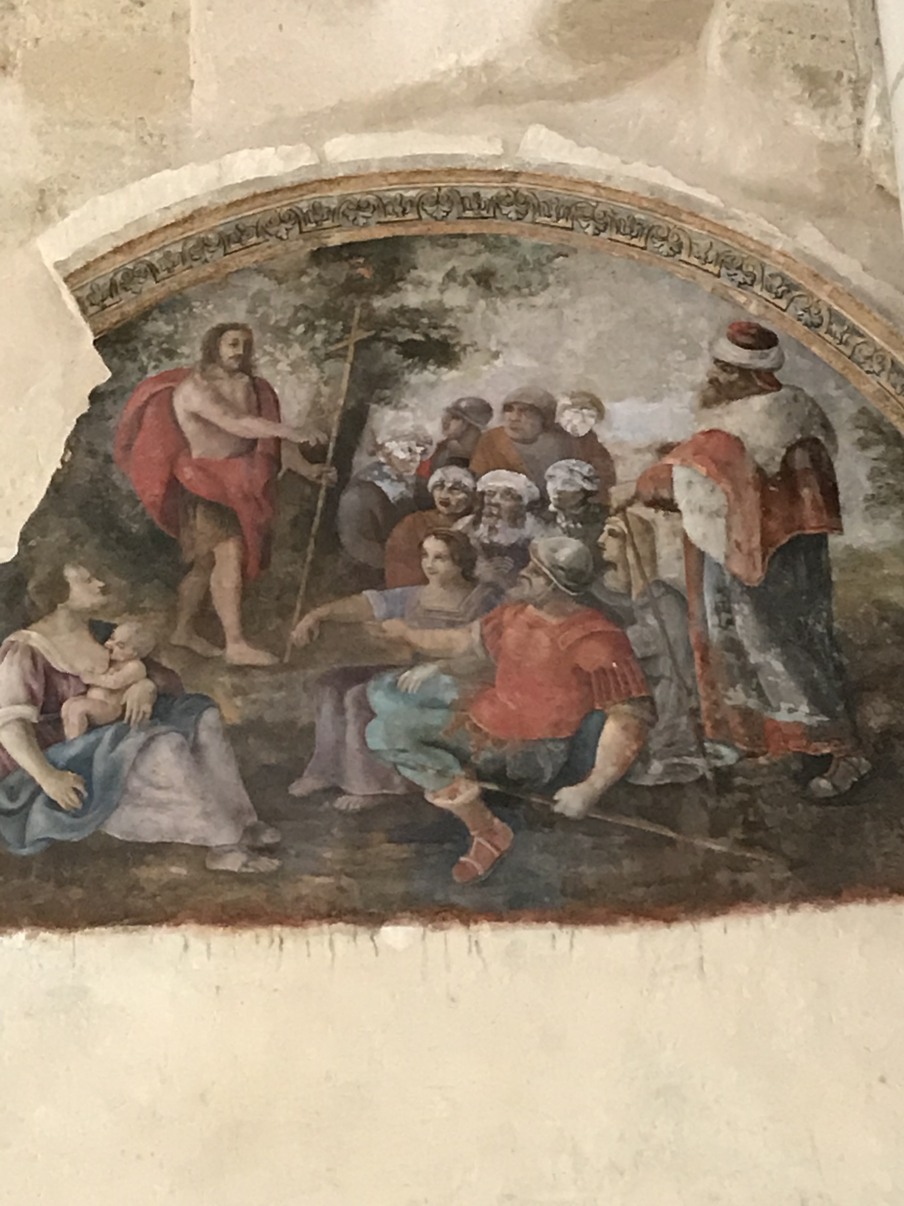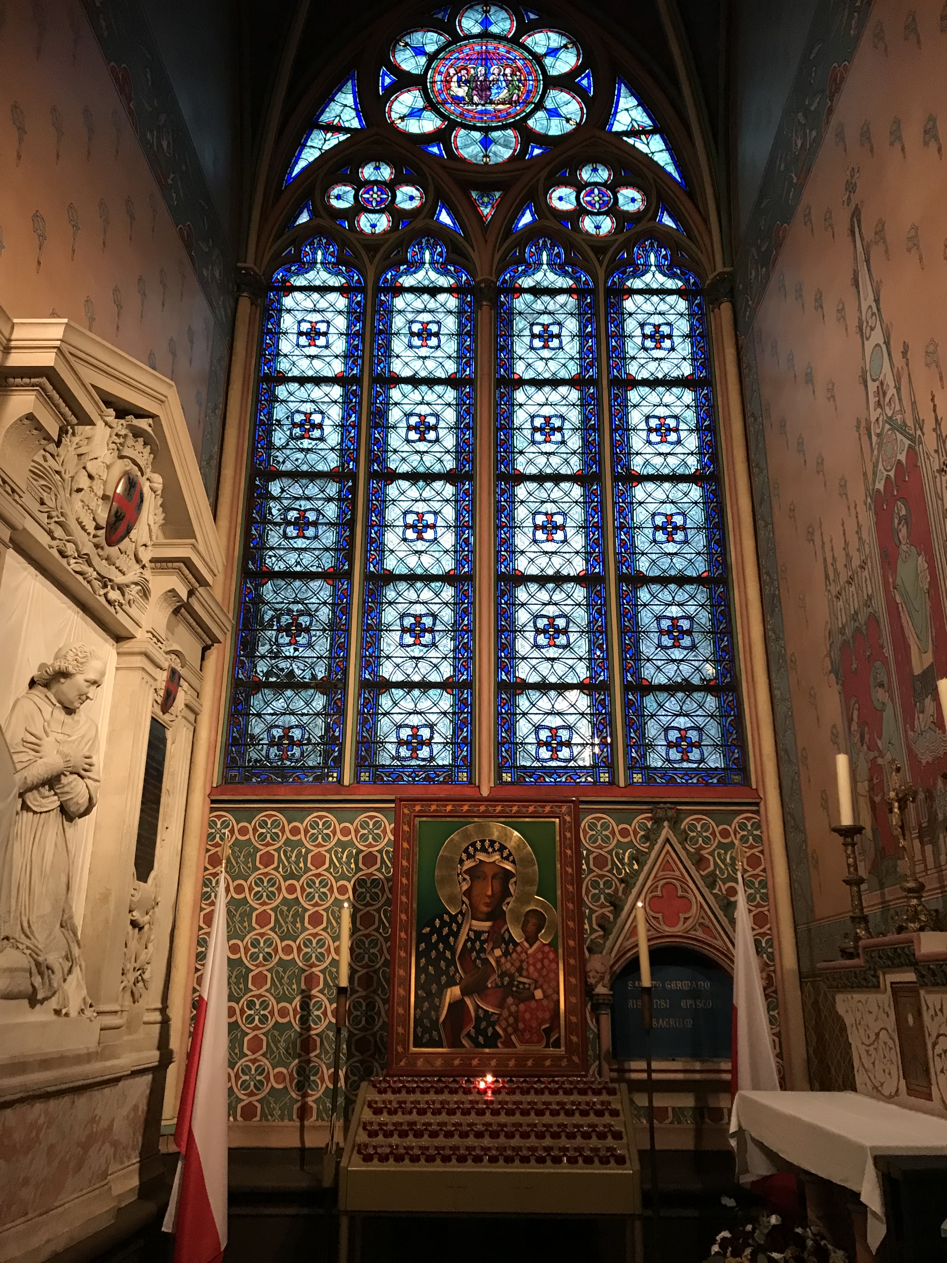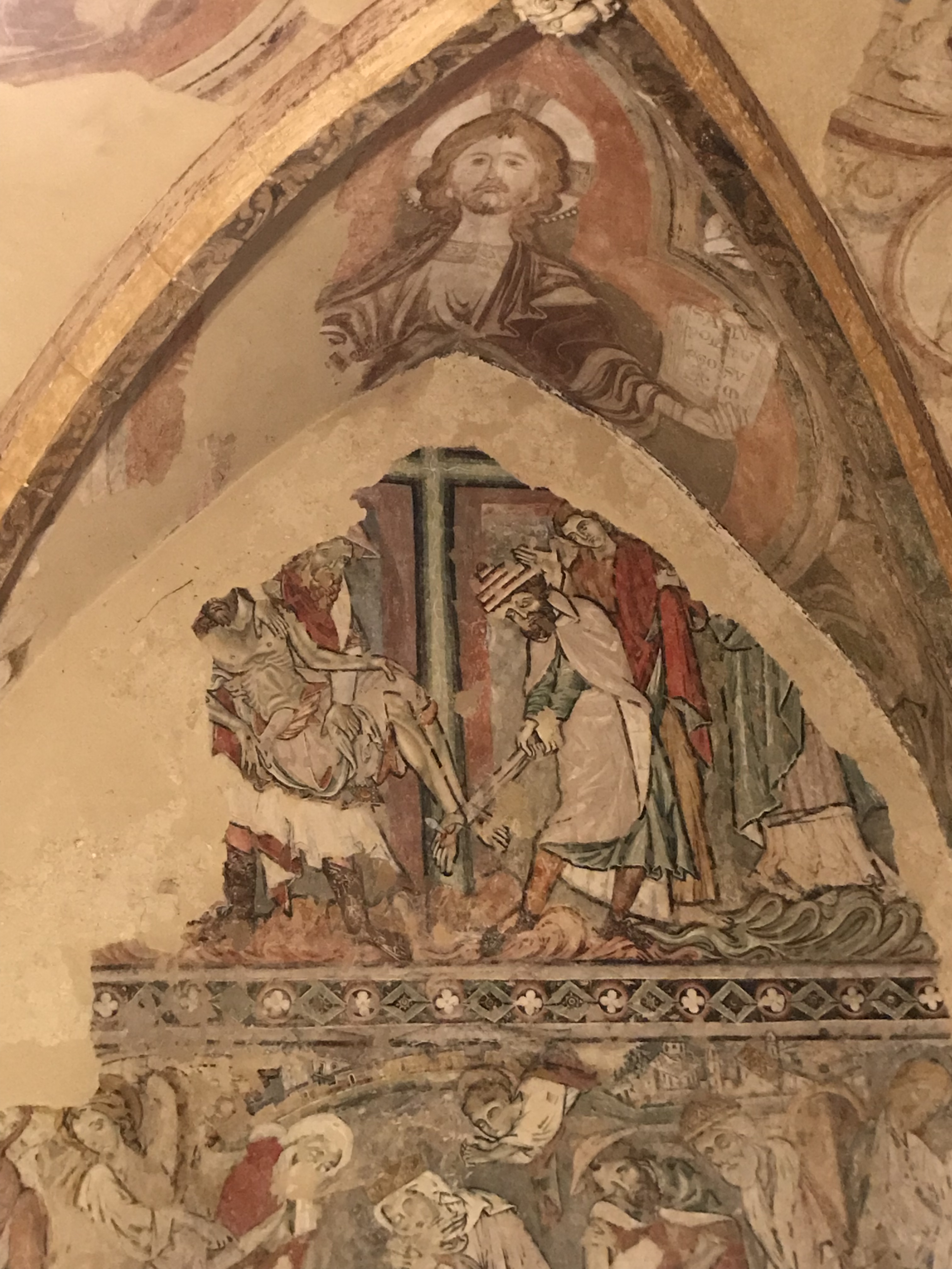 The huge nave is cold, empty, and unconsecrated. Only a few fragments of wall paintings remain. There’s nothing much to look at except a kind of desk off to one side, where one person can sit and look at computer images. A small group was huddled over it and I could not even get close. And the building was really cold, even on a sunny day in May. It felt like more than just a physical coldness.