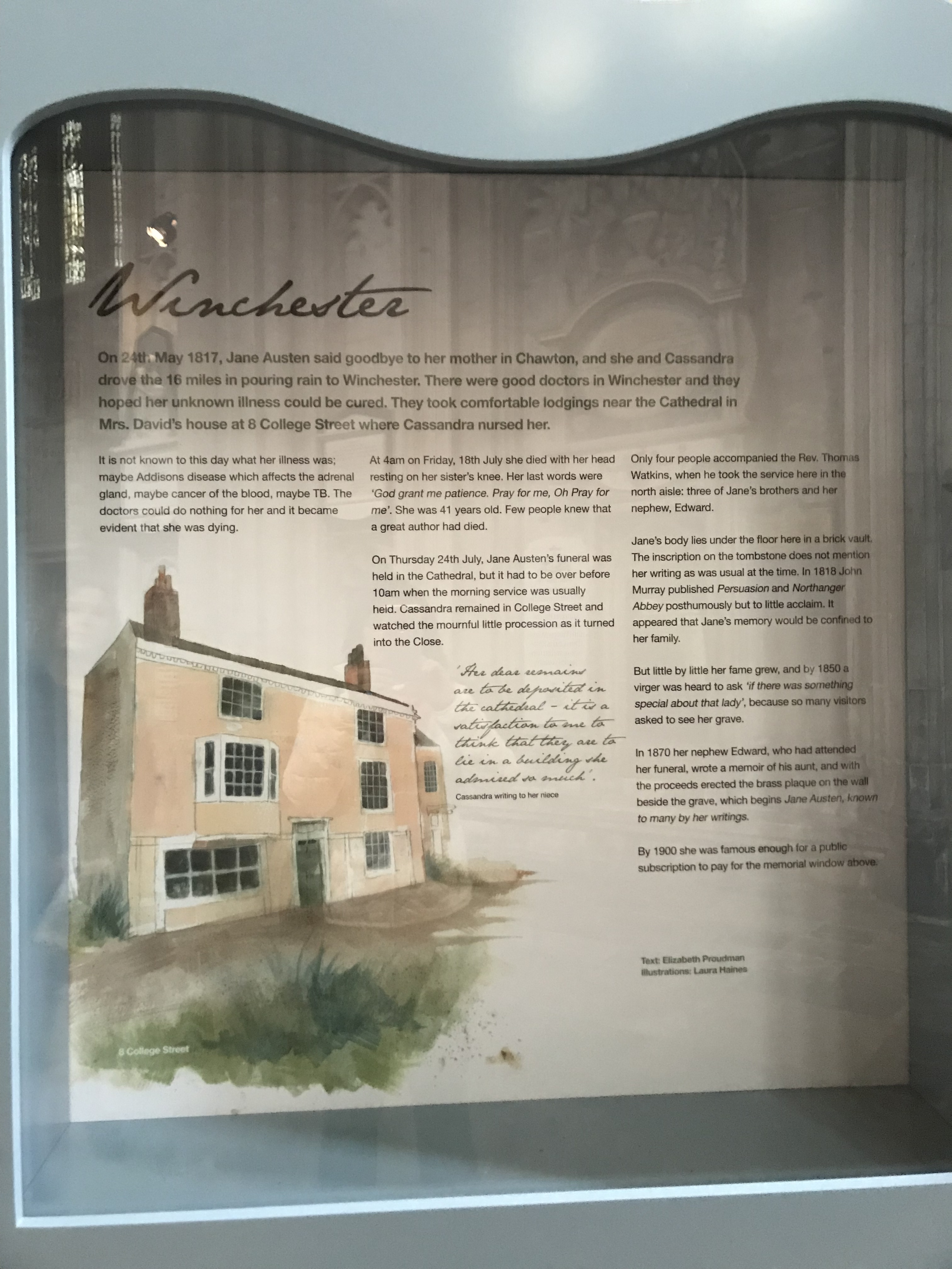 No doubt Jane knew the medieval cathedral well, having lived the last eight years of her life in nearby Chawton Village. She spent the last eight weeks or so of her life in Winchester, undergoing treatment that didn’t work. (Theories about her illness include Addison’s disease and Hodgkin’s lymphoma, among others).