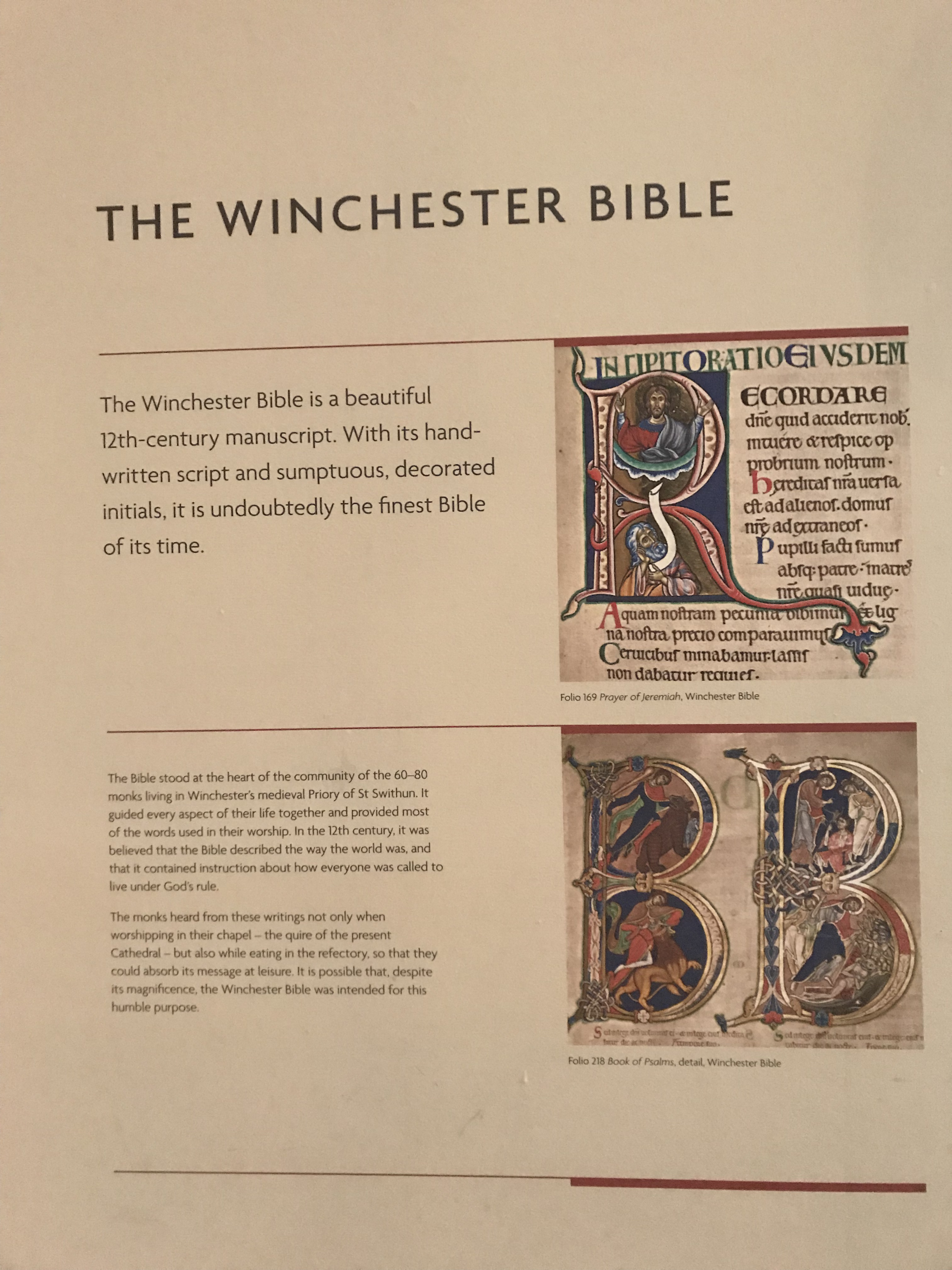 The beautiful illuminated Winchester Bible, used by the 60 to 80 monks in residence in the 1100s, is worth a visit all by itself.