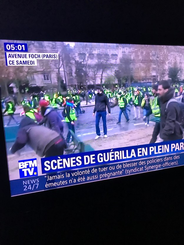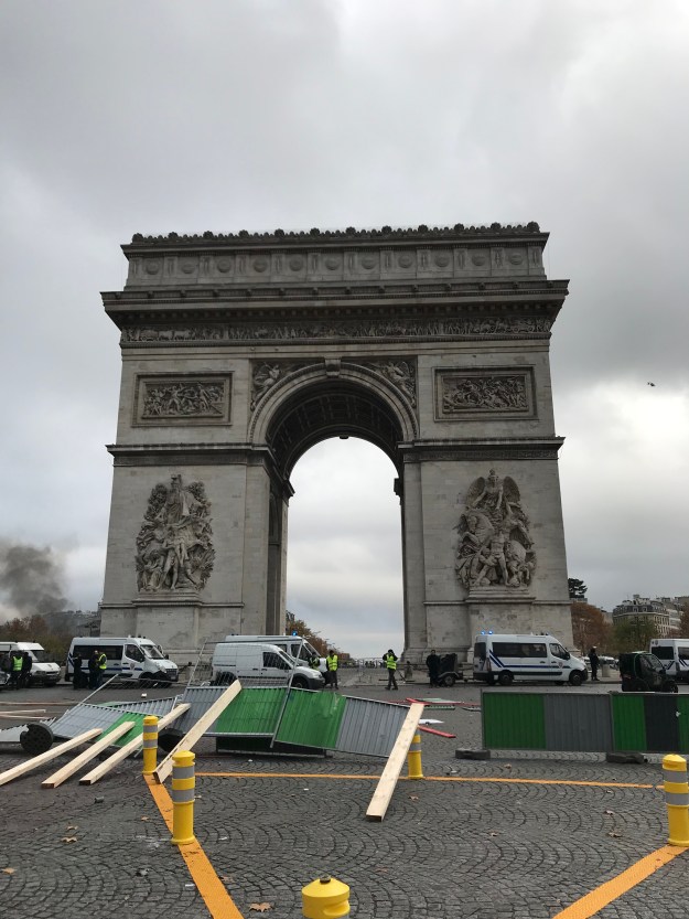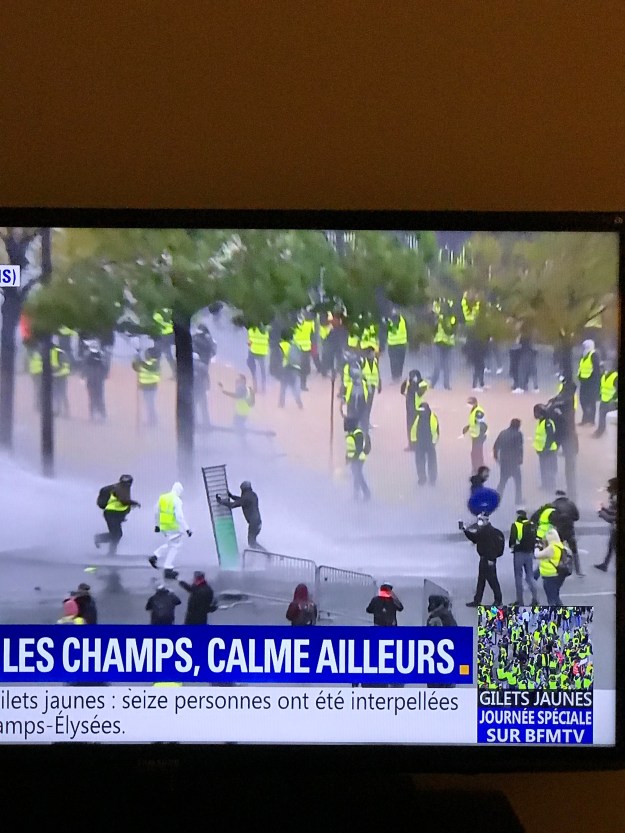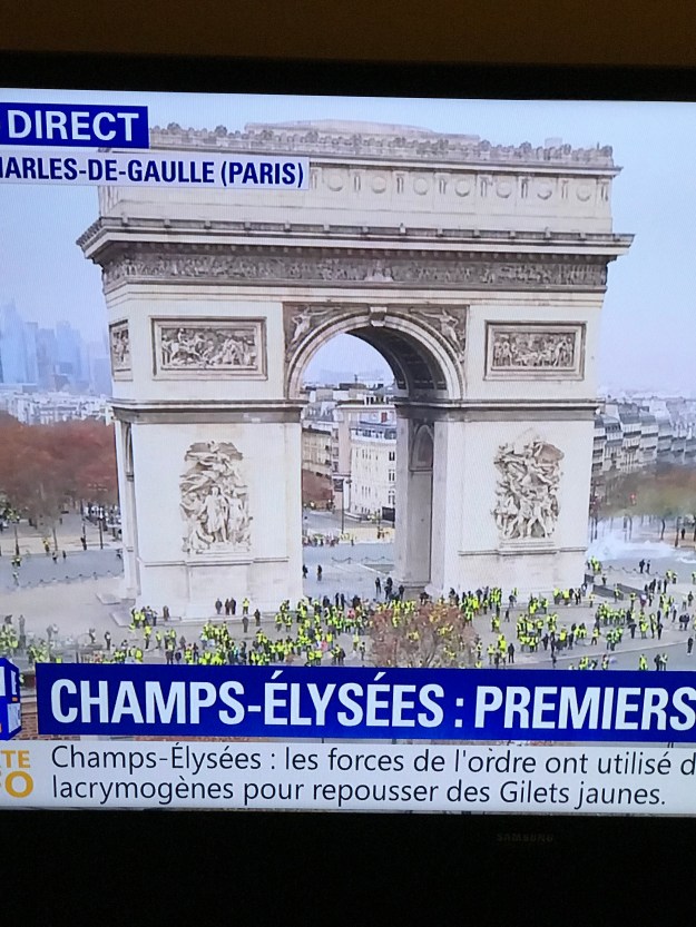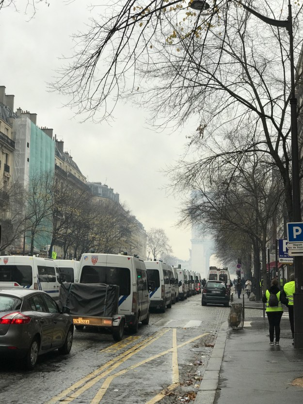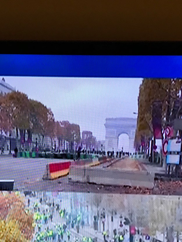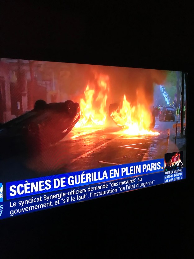 Early in the afternoon, we bought some groceries and decided to hole up in our apartment until we left Paris in the morning. We felt safe because police had completely evacuated the Place Charles de Gaulle, the huge traffic circle that surrounds the Arc de Triomphe. Police vans by the dozen were parked on a nearby street, and we were on a smaller street, in an apartment inside a courtyard with a locked door to the quiet little rue de l’Etoile outside.