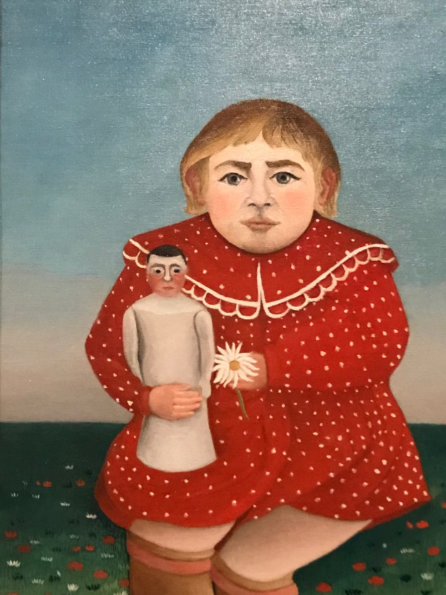 Henri Rousseau painted this girl with a doll around 1994-5. She’s a beautiful child, but she also looks strangely mature. She looks self-aware, dead serious, possibly thinking intently of her future. Is the doll on her lap her adult self, upright and a little rigid? Could be. Then again, maybe she’s going to grow up to be a heartbreaker. Maybe the doll is a man that her future self will tame. She remains an enigma, in the Musee de l’Orangerie in Paris.