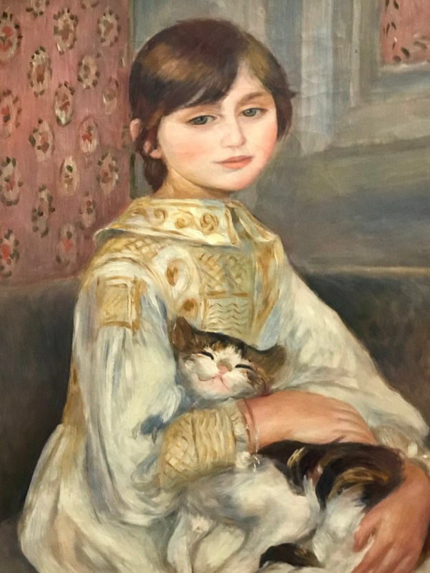 Julie Manet, the daughter of Berthe Morisot and Eugène Manet, had her childhood portrait painted by Pierre Auguste Renoir, no less. Renoir had a particularly sunny outlook; he must have encouraged not only the child but also her cat to smile.