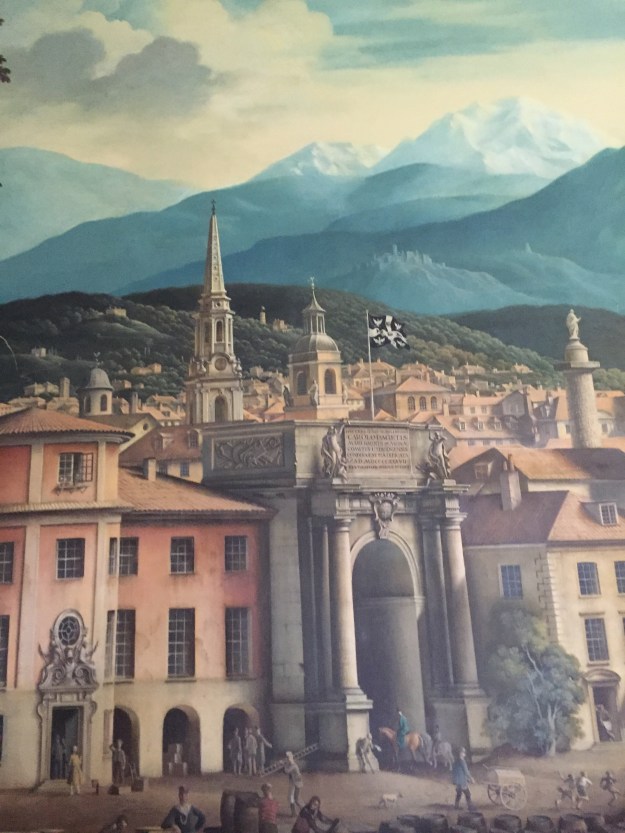 It’s hard to see the images that go high up the stone wall of the catheral. But there’s a horizontal copy nearby. Photos of it are not great because it’s covered by glass, but the reflections of the stained glass windows are sort of a bonus. I loved the images, especially the animals like the smiling stag and the hunting dogs above.