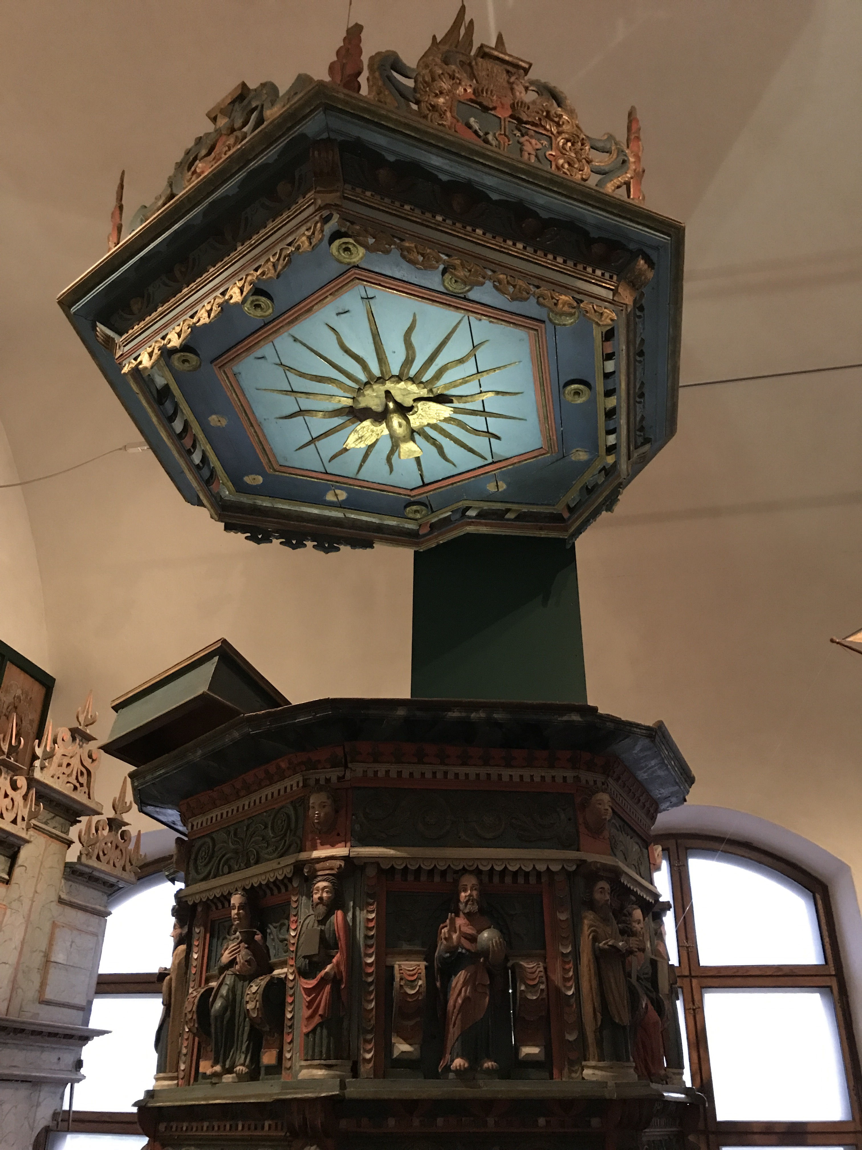 This pulpit is from the Kalvia Church, around 1726. I like the cloudy heavens painted on its ceiling just above the preacher’s head.