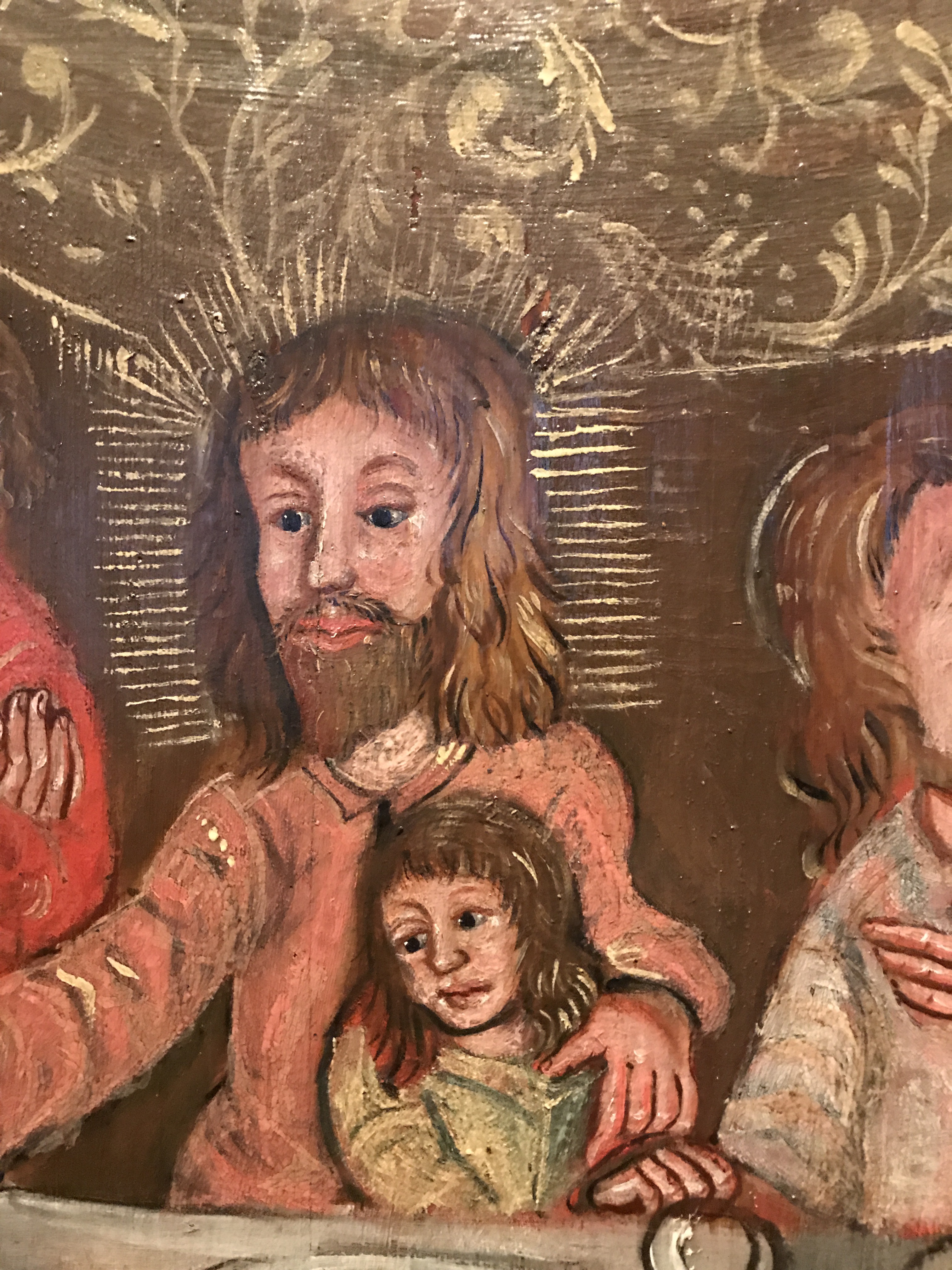 Jesus (with spiky sun-ray halo) seems to be holding a child in his lap. So the story is maybe doing double duty here: “Let the little children come unto me.”