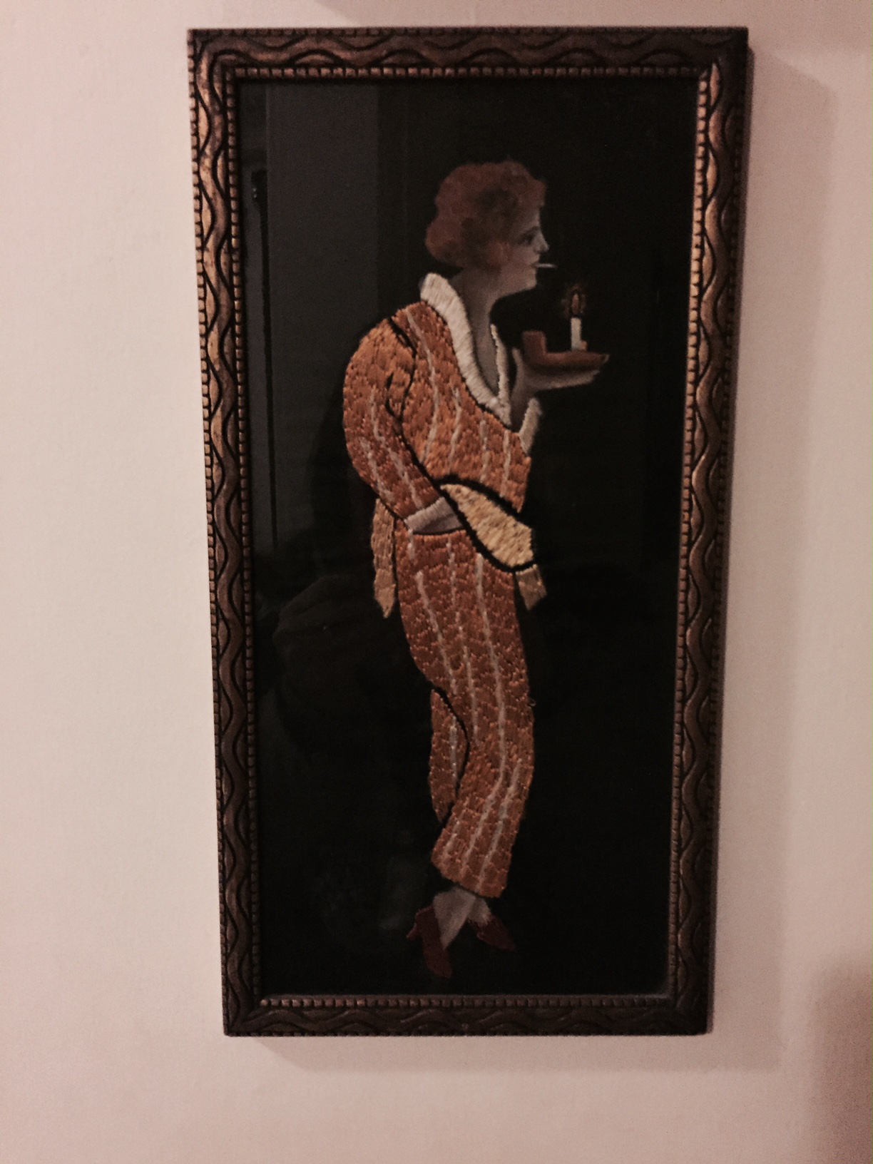 And at home, women enjoyed their new freedoms as much as when they were out and about. On the door of the women’s restroom, I found this charming portrait of a woman wearing pajamas–with pants! And lighting a cigarette from her bedtime candle! The world was changing, in Budapest as in other cities. The House of Art Nouveau is a delightful wander into the past, and a look at what the future would bring.