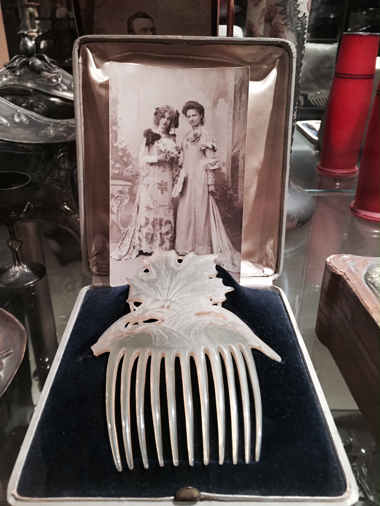 In fashion, the period began with Victorian primness and fussiness. The ladies above pose with an ivory comb perfect for hair styled in intricate billows, braids and loops.